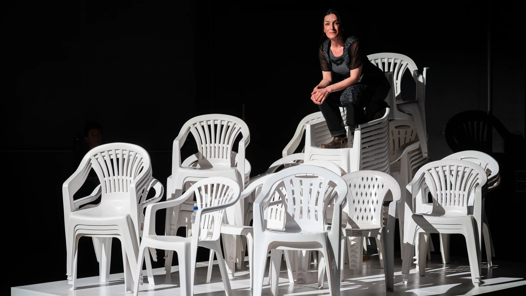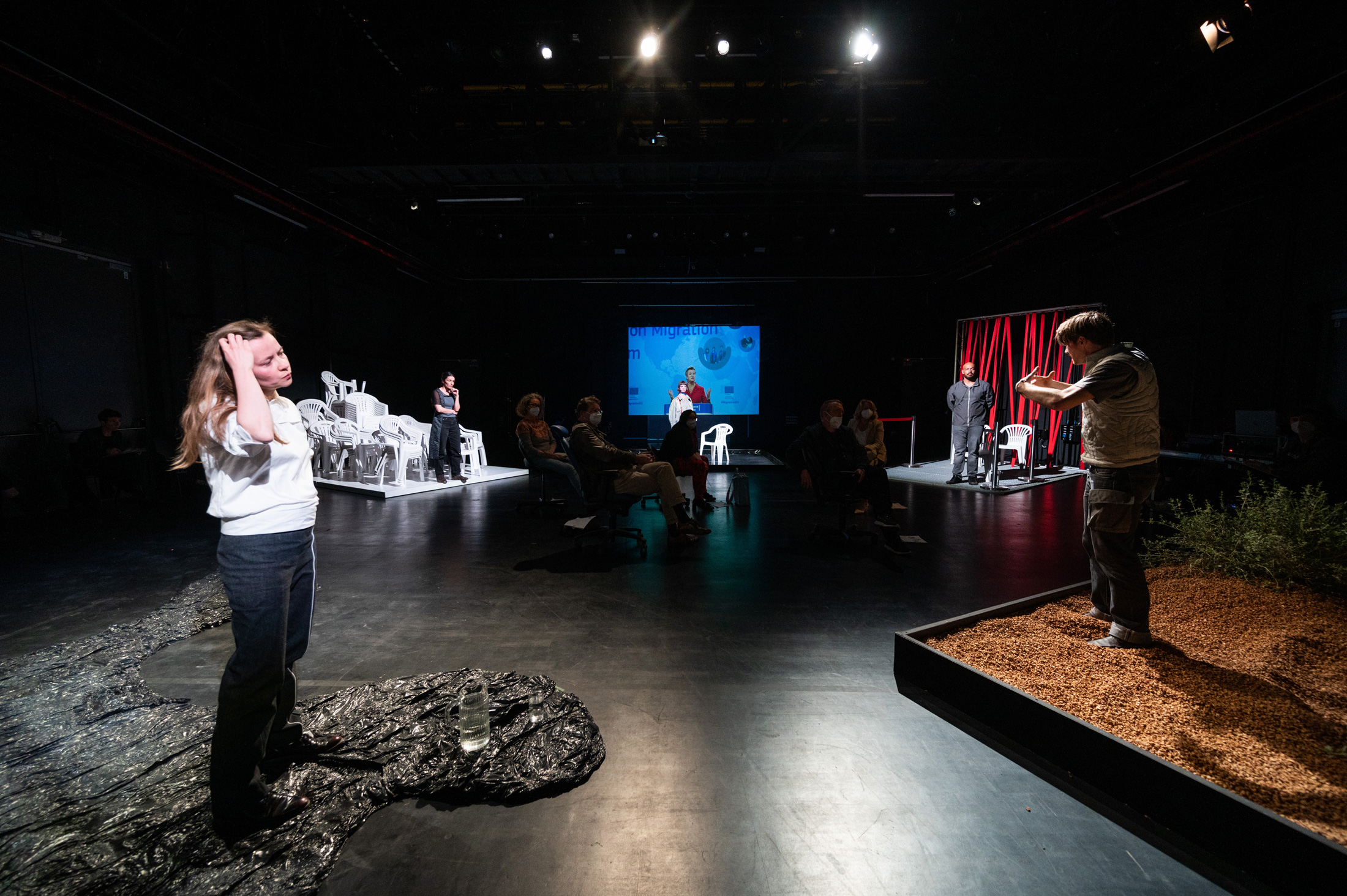 Five characters – based on five living experts and selected in a months-long research process – voice their stories and perspectives: A Greek farmer whose 300-year-old olive trees are repeatedly cut down by refugees for firewood, a German human rights lawyer from Bavaria who stands up against post-colonial injustice in Moria, a former Greek NGO worker who guides us through the Island, the Austrian political scientist and architect of the EU-Turkey deal Gerald Knaus and the Swedish EU Commissioner for Home Affairs, Ylva Johansson, who is working on her mission. The audience finds itself in the middle of conflicting perspectives and is guided by a voice who has survived arriving in Europe.